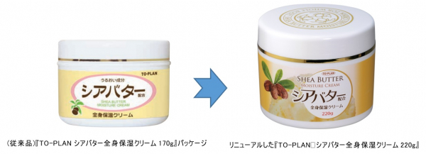 「TO-PLAN シアバター配合全身保湿クリーム220g」は、2012年の発売以来、当社のシアバターシリーズ累計1,000万個売れている人気商品で、肌の乾燥を防ぐ全身保湿クリームです。主成分のシアバターはじめ、コラーゲン、ヒアルロン酸、オリーブ油を配合し、肌のうるおいを長時間キープすることから、発売以来ユーザーの口コミで、「高価なシアバターも使ったが、TO-PLANシアバターと同じ効果だった。」「数千円するクリームよりも保湿効果が断然あった」「量も多くたっぷり使える」「他のクリームではすぐ乾燥したが、寝る前に塗り翌朝外出しても肌が乾燥しなかった」等、品質の良さとコストパフォーマンスに定評があるロングセラー商品です。