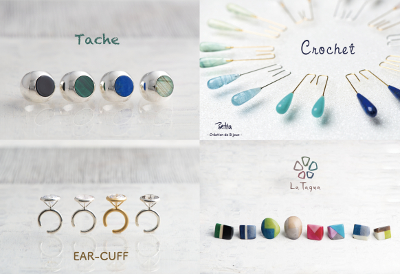 zetta ゼッタからは、新作『Tache タッシュ』の初のお披露目です。ころりと丸いフォルムにペタッと張り付いたシミ(=tache 仏語)のようなカラーストーン。zetta ゼッタらしいポップなリングコレクションは、4種類の天然石をピンキーリングとスタンダードサイズの両方で展開しています。
