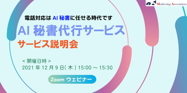 コールセンターサービスを提供しているマーケティングアソシエーション株式会社(本社:東京都台東区 代表取締役:相内あゆ美、以下当社)は、2021年12月9日(木)に、ウェビナー「電話対応はAI秘書に任せる時代です AI秘書代行サービス説明会」を開催いたします。