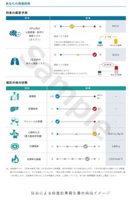 少量の採血で、日本初の約7,000種類のタンパク質を一度に測定する技術を活用した検査サービス(注2)に、心筋梗塞や脳卒中などの疾病に加え、肺がんを検査対象としました。肺がんが検査日から5年以内に発症する確率を可視化し、将来的なリスクを予測します。
