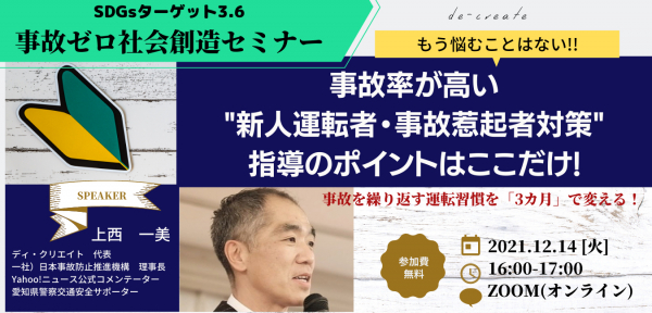 すべての方が交通事故の加害者にも被害者にもならない社会の創造を目指す株式会社ディ・クリエイト(東京都港区 代表取締役 上西 一美)は、2021年12月14日(火)に、事故ゼロ社会創造セミナーを無料で開催いたします。