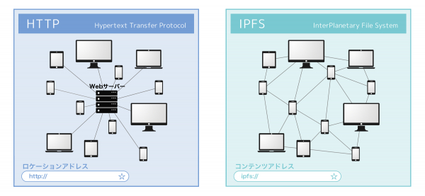 【(左)従来のインターネット(Web2.0)】 【(右)IPFSネットワーク(Web3.0)】