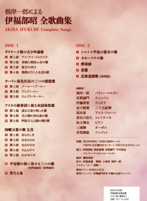 ついに完成「根岸一郎による伊福部昭全歌曲集」(2CD+BOOK) 声楽家の根岸一郎の長年の研究の成果をセッション録音。 小林淳による解説書は46頁で豊富な資料写真を掲載!