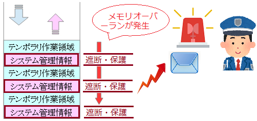 オーバーランすると作業領域の後ろにいるシステム管理情報が上書き破壊されます。