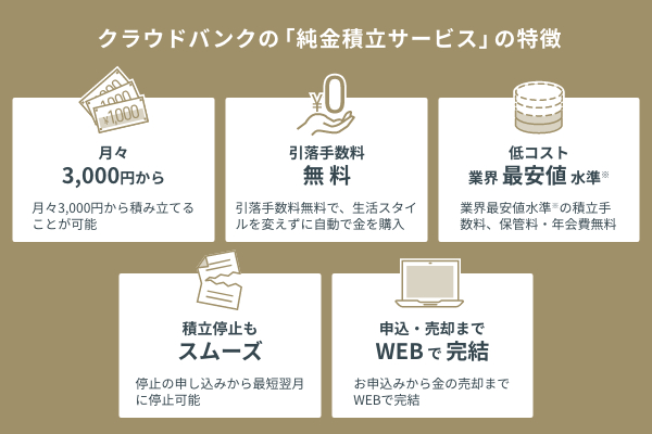 クラウドバンクの純金積立サービスは、月3,000円から積み立てることができ、保管料や年会費はかかりません。