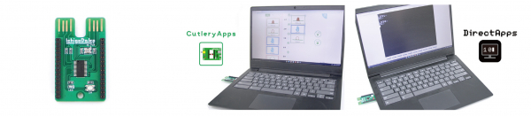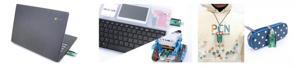 GIGA IchigoDakeはシリアル通信モジュールを搭載しているのでUSBポートに差し込むだけでパソコンとの通信が可能。ブラウザでも動作するCutleryAppsやDirectAppsを使えばChromebookでもプログラミングができます。