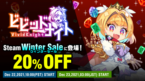 Steamにて開催される、“Steam ウィンターセール”に、パーティ構築型ローグライクゲーム『ビビッドナイト』が登場!日本時間の12月23日 (木) 午前3時より、初の20%オフとなります。国内外で人気を博した本作をこの機会にぜひプレイしてみてください!