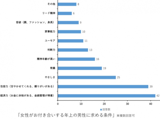 結果は見ての通り、大半の女性は経済力と包容力を年上の男性に求めていることが今回の調査から明らかとなりました。