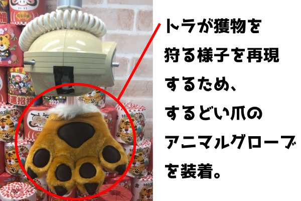 干支“とら”ねばキャッチャーは、2022年が寅年ということで、『トラ』にちなんだクレーンゲームとなっております。クレーンのアーム部分にはトラの鋭い手(前足)を彷彿とさせる手袋を装着し、まるでトラが獲物を狩るような動作を再現したクレーンゲームとなっております。