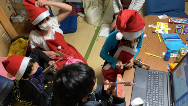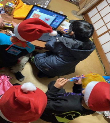 その第1弾の取り組みとして、12月23日(木)にオンラインでのクリスマスイベントを開催いたしました。子どもたちは、11月中に2度のワークショップを含む相互交流で覚えた英語表現を駆使して当日のクリスマスクイズに挑戦、プレゼント宝探しを楽しみました。