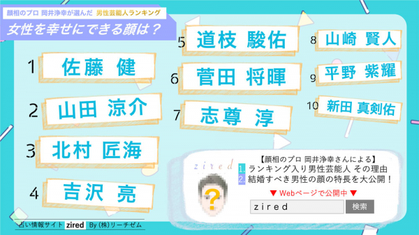 株式会社リーチゼムは2021年12月27日、運営する占い情報サイトziredで『観相学的 結婚したい顔 女性を幸せにする男性芸能人ベスト10』を発表した。