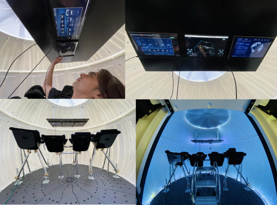 実際のクルードラゴン宇宙船と同様に、床面から高い位置に可動式の4つの座席と、天井から吊り下げた3面のモニターを有しています。モニターはタッチ型液晶ディスプレイになっており、実際に操作することも可能です。このシミュレーターは、茨城県猿島郡境町にあるASTRAX民間宇宙事業想像教育訓練センター(ASTRAX宇宙センター)に設置しております。