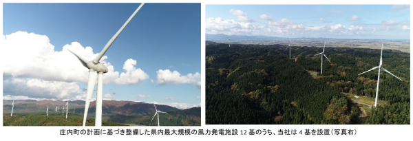 建設した風車は、高さ131メートル、羽根の直径92メートルで、増速ギアがないことで低騒音化と、風速に応じたスピードで羽根を回転させることで高効率化を実現しています。出力は1基当たり1,870キロワット、稼働した風車12基の合計年間発電量は1.7万世帯分に相当する6万メガワット時で、県内最大規模です。発電した電力はやまがた新電力に売電する予定で、本年6月には発電による収益の一部を庄内町に寄付する協定を3社で結び、毎年各社400万円ずつを2022年度から20年間にわたり寄付し、町は林道整備など農林漁業発展のために活用するとのことです。
