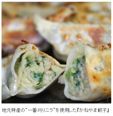 当社は、金山町で生産された“一番刈りニラ”のみをたっぷり使ったスタミナ餃子『かねやま餃子』を開発・製造し、当社の販路を活かして販売することで、地元の特産品の販売促進と認知拡大、雇用促進などを図り、地元に貢献します。
