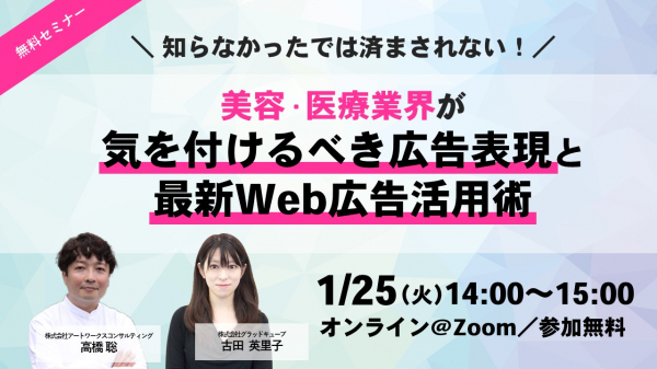 株式会社グラッドキューブ(本社:大阪府大阪市 代表:金島 弘樹 以下当社)は、株式会社アートワークスコンサルティング(本社:東京都新宿区、代表:高橋 聡)と共催で、1月25日(火)14:00〜広告を出す上で重要な薬機法・景品表示法の基礎知識やweb広告を使った集客の成功事例を紹介するオンラインセミナーを開催いたします。
