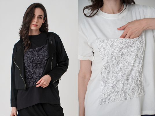 ”まるでゴミ袋の様な” アートTシャツは、サスティナブル素材の使用と、中央部のゴミ袋の様なアートピース部はポケットになっており、簡易的なエコバッグとしても利用可能で、機能面でも環境配慮することはもちろん
