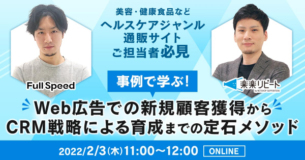 リピート通販・D2C特化型ECカート「楽楽リピート」を提供する、株式会社ネットショップ支援室(東京都新宿区、代表取締役:山本皓一朗、以下「ネットショップ支援室」)は、インターネットマーケティング支援を行う株式会社フルスピード(東京都渋谷区、代表取締役社長:吉澤竹晴、以下「フルスピード」)と、ヘルスケアジャンル(美容・健康食品など)事業者様向けのオンラインセミナーを2022年2月3日(木)に開催することをお知らせいたします。