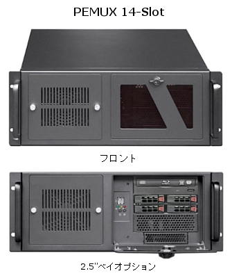 通常のシステムでは7本の拡張スロットを14本装備したPEMUX規格 ラックマウント4Uシステムで、1x 3.5” & 3x 5.25” ベイを装備しています。