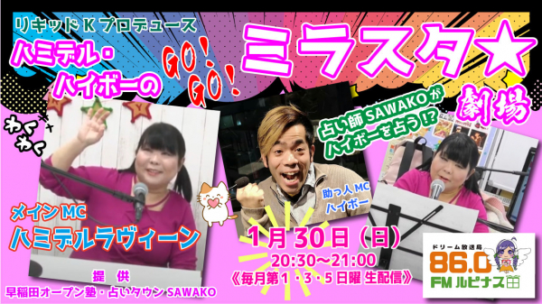 ドリーム放送局・FMルピナス(加藤貴博放送局長)で1月30日(日)の20時30分〜21時、ハミデルラヴィーンがメインMCを務める番組「ハミデル・ハイボーのGO!GO!ミラスタ☆劇場」(以下、ミラスタ☆)の放送を予定しています。(助っ人MCはハイボーが担当します)