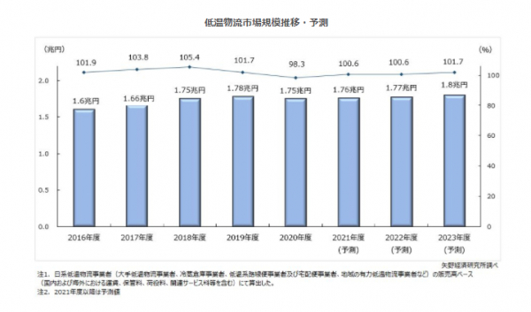 2021年度の低温物流市場規模は、日系低温物流事業者の国内外における販売高ベースで、前年度比100.6%の1兆7,600億円と予測する。