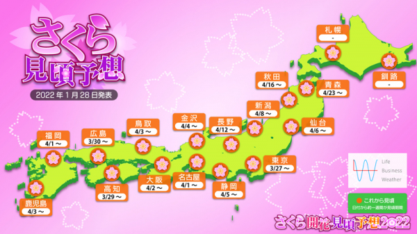 「暮らしに役立てる天気」を提供する株式会社ライフビジネスウェザー(本社:東京都中央区、代表取締役:石川勝敏 以下、LBW)は、2022年1月28日、第1回さくら開花・見頃予想を発表いたしました。