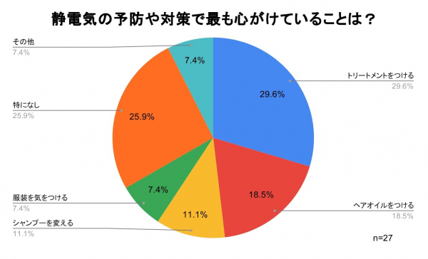 「静電気の予防や対策で最も心がけていることはなんですか?」の質問では、『トリートメントをつける』が最も多い29.6%という結果となり、次いで『特になし』が25.9%、『ヘアオイルをつける』が18.5%となりました。