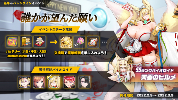 今回のアップデートで2部構成となる新イベントシナリオ「誰かが望んだ願い」を開催いたします!今回は第1部が公開となりました。イベントアイテムを集めるとSSランクのバイオロイドなど豪華報酬と交換することができますので是非この機会にプレイしてみてくださいね!!