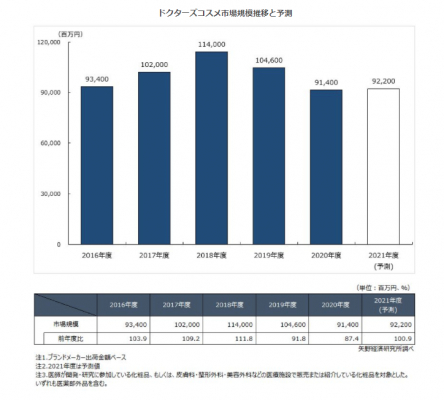 【矢野経済研究所プレスリリース】ドクターズコスメ市場に関する調査を実施(2021年)〜2020年度のドクターズコスメ市場は前年度比87.4%の914億円〜