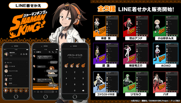 シリーズ累計3,800万部突破!TVアニメ化した『SHAMAN KING』のLINE着せかえがインクルーズの販売アカウントより9点同時に配信を開始!黒を基調に各キャラクターのメインカラーが目を惹く男女ともに使いやすいデザインとなっております。絶賛販売中のLINEスタンプと合わせてTVアニメ『SHAMAN KING』の世界観をお楽しみ下さい。