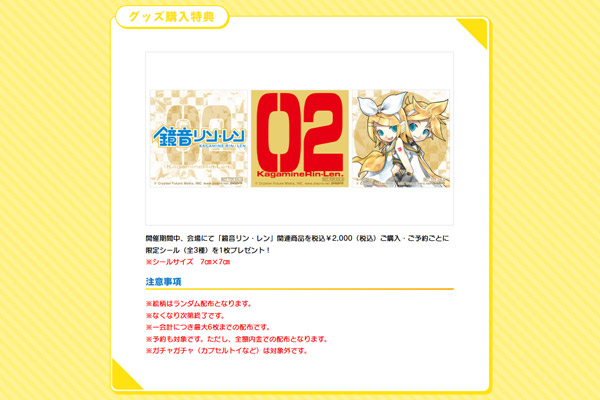 開催期間中、会場にて『鏡音リン・レン』関連商品を税込2,000円(税込)ご購入・ご予約ごとに【限定シール】を1枚プレゼントいたします。