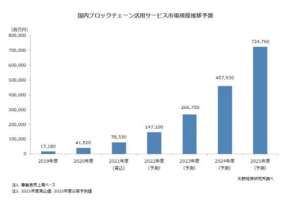 【矢野経済研究所プレスリリース】ブロックチェーン活用サービス市場に関する調査を実施(2021年)〜2021年度の市場規模は約783億円の見込、2025年度には7,247億6,000万円に達すると予測〜
