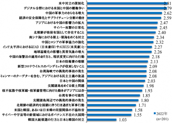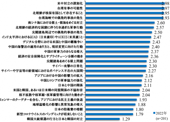 22年に北東アジアの平和リスクでは、「米中対立の深刻化」は2.94点、「台湾有事の可能性」は2.91点、「台湾海峡での偶発的事故の発生」が2.9点と、「北朝鮮は核保有国として存在する」が2.8点とこの4項目が突出しています。