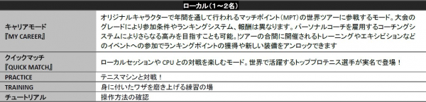 クイックマッチでは、世界のトップテニスプレーヤー16名が実名で登場。あこがれの選手との夢のマッチアップが実現するほか、実際にトッププロとしてプレイすることも可能です。戦略を極めたCPUとの歯ごたえある一戦はもちろん、ローカルでのフレンドマッチやオンライン対戦も楽しめます。