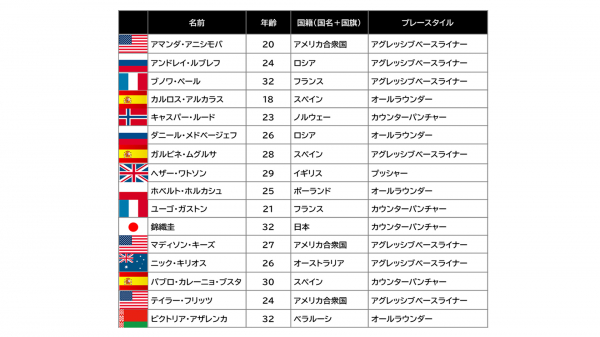 クイックマッチには、世界の第一線で活躍する16選手が実名で登場。日本が誇る錦織圭選手(以下選手敬称略)はもちろん、ロシアのダニール・メドベージェフをはじめ、ガルビネ・ムグルサ(スペイン)、アンドレイ・ルブレフ(ロシア)、ニック・キリオス(オーストラリア)、アマンダ・アニシモバ(アメリカ合衆国)など、若手からベテランまで個性豊かな選手たちを選択することができます。