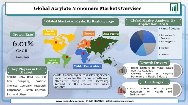 Research Nester Private Limitedは、アクリレートモノマー市場の予測評価を提供する調査レポートを2022年2月 4日 に発刊しました。これは、アクリレートモノマー市場の成長ドライバー、市場機会、課題、脅威など、いくつかの主要な市場ダイナミクス強調しています。