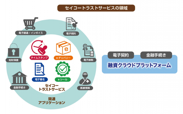 セイコーソリューションズは、この「融資クラウドプラットフォーム」を含めた電子契約をはじめ、流通する電子データの信頼性を保証するサービス全般を「セイコートラストサービス」として展開しています。