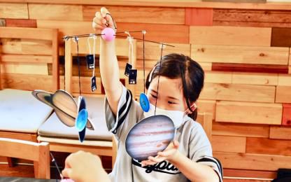 事前に用意したクラフトキットを使用し、各惑星の名前や大きさの比較など学びながら、太陽系のモビールを制作します。明光キッズeのネイティブティーチャーが進行します。
