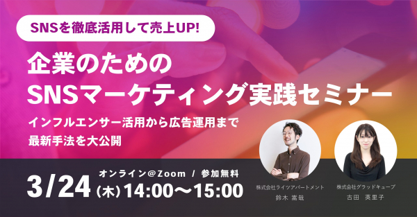 株式会社グラッドキューブ(本社:大阪市中央区 代表取締役 CEO 金島弘樹 以下:グラッドキューブ)は、株式会社ライツアパートメント(本社:東京都港区、代表:川西 崇介)と共催で、3月24日(木)14:00〜売上 UP に向けた SNS の活用方法をテーマにオンラインセミナーを開催いたします。