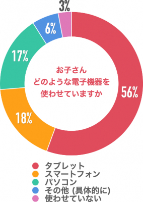 ご回答いただいた方は、「タブレット」が最も多く56%、「スマートフォン」が 18%、「パソコン」が17%、「その他(具体的に)」が6%、「使わせていない」が3%でした。