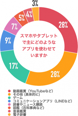 「動画鑑賞(YouTubeなど)」と「その他(具体的に)」が28%、「ゲーム」は17%、「コミュニケーションアプリ(LINEなど)」が9%、「読書やニュース購読」が7%、「図鑑(百科事典など)」が5%、「音楽鑑賞」が4%、「電子辞書」が3%という回答でした。