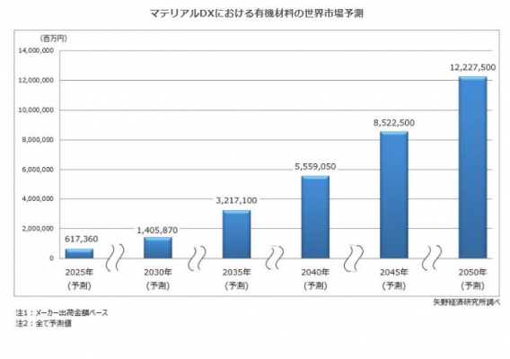 株式会社矢野経済研究所(代表取締役社長:水越孝)は、世界のマテリアルDX関連市場を調査し、3区分別や研究機関の動向、将来展望などを明らかに致しました。ここでは、マテリアルDXにおける有機材料の世界市場予測について公表します。