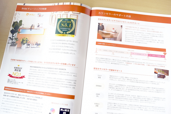 Bridalチューリップは、サービス開始から足掛け12年となり、会員様のサポートに力を入れることでノウハウを積み重ねてまいりました。お客様に当社のサービス内容や強みを容易にご理解頂けるよう、その入り口であるパンフレットの強化は最重要課題であると考えております。今後も、お客様への安心に繋がる、最新の情報を提供してまいります。