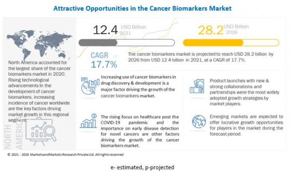 MarketsandMarketsはレポートの公開資料において、世界のがんバイオマーカー市場は2021年に124億ドル、2026年までには282億ドルに達し、予測期間のCAGR17.7%で成長するとの予測結果を発表しました。
