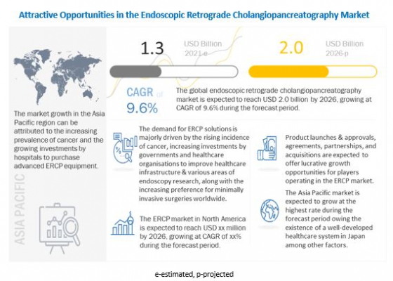 MarketsandMarketsはレポートの公開資料において、世界の内視鏡的逆行性胆道膵管造影(ERCP)市場は2021年に13億ドル、2026年までには20億ドルに達し、予測期間のCAGRは9.6%になるとの予測結果を発表しました。