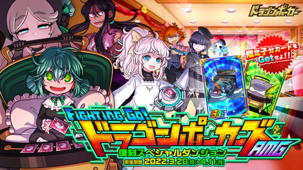 株式会社アソビズム(本社:東京都千代田区、代表取締役:大手智之)は、App Store・Google Playにて好評配信中のリアルタイム合体カードバトル『ドラゴンポーカー』で、2022年3月28日(月)より復刻スペシャルダンジョン「FIGHTING GO! ドラゴンポーカーズAMG」を開催いたします。
