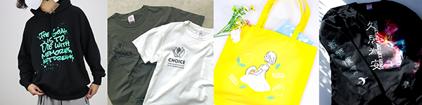 Tシャツに限らず、トートバッグやマスク、エプロン、パーカーなど約100種類ご用意しています。