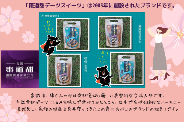 「棗道甜デーツスイーツ」は2003年に創設されたブランドです。中東のナツメヤシの実とクルミを組み合わせたアイディアで有名になりました。創設者、陳さんの母親は食材選びに厳しい典型的な台湾人お母さん。一貫してヘルシーな食材しか子供達に与えないというこだわりを持つ陳ママは、長年ナッツ類を食べる習慣があり、ある時、スーパーフードの代表であるデーツにくるみを挟んで食べてみたところ、口中で広がる絶妙なハーモニーを発見しました。家族の健康を長年守ってきたこの食べ方がこのブランドの始まりです。2000年末にこのスーパーフードを商品化しました。瞬く間に台湾各地で口コミにより広がり、アメリカ大使館に相当する公館の職員の方々からも注文を受け、毎年春節には中華航空やI T企業などから大口注文を受けるほどです。もちろん、お土産品としての人気も高まりました。