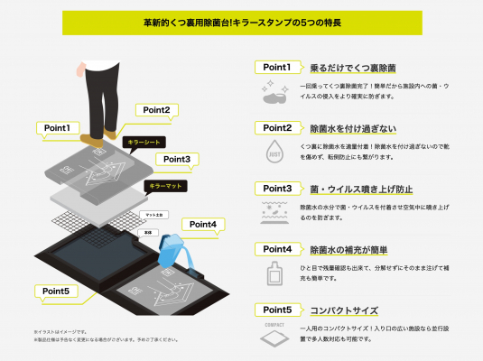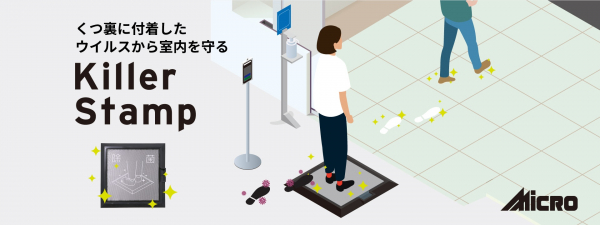 『Killer Stamp』は、除菌水を浸み込ませたマットを通過することにより「くつ裏に付着した菌やウイルスを除菌する」新しい感染症拡大防止アイテムです。『Killer Stamp』を入口に設置することで、これまで看過されてきたくつ裏から、屋内に菌やウイルスが持ち込まれることを防ぎます。