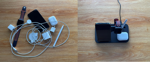 iPhone、Apple Watch、AirPods、Apple Pencilの4台同時にワイヤレスで充電できます。ケーブルや充電器でゴチャゴチャしないでこれ1台にまとめれば電源コンセントまわりもスッキリ片付きます。カバンの中を傷つけない専用ケースもあり、軽量208gや折りたたんで持ち運びやすいので旅行や出張でとても便利な4in1チャージャーはいかがでしょうか。