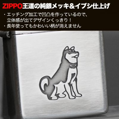 おすわりのポーズやクルンと丸まったしっぽが、お利口さんな柴犬らしさ全開のデザイン。絵柄をエッチングで立体的に加工した、ZIPPO定番のフォルムとなっています。シンプル&キュートなZIPPOライターです。
